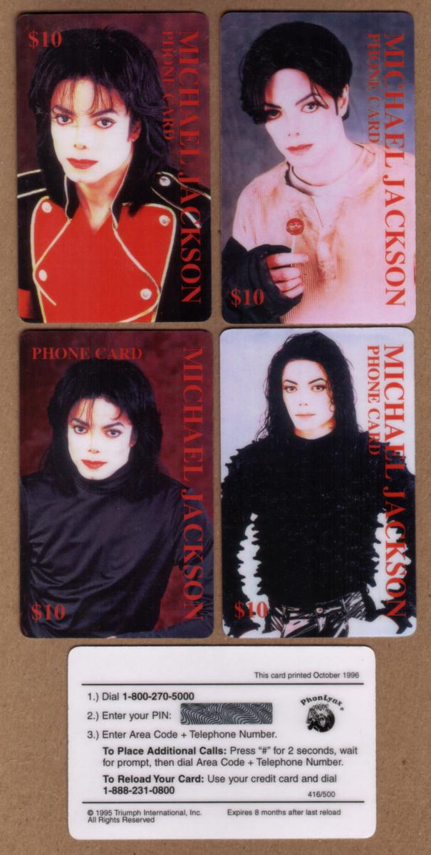 These cards visually capture different stylistic phases of Michael Jackson’s appearance, aligned with his status as a legendary music artist known for pop, rock and roll, disco, and rhythm and blues genres. They serve as collectible phone cards celebrating his enduring impact as a global music performer.