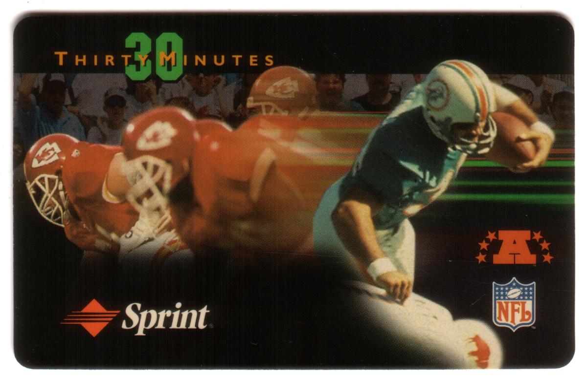 At the top center of the card, the text "Thirty 30 Minutes" is displayed in green and yellow lettering. The lower left corner features the Sprint logo in white and orange, indicating the sponsor or issuer of the card. The bottom right corner showcases two NFL logos: the classic NFL shield and the AFC conference emblem with five orange stars arranged around an "A," emphasizing the American Football Conference affiliation of the game.