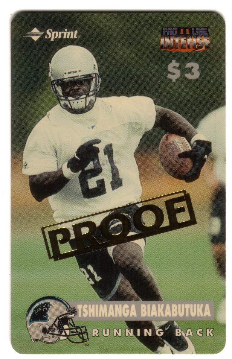 This collectible card features Tshimanga Biakabutuka, a professional football player who played as a running back in the National Football League (NFL). The card is from the Proline Intense 1997 series produced by The Score Board Inc. It is identified as card number 34 out of a limited set of 50. The front of the card prominently displays Tshimanga Biakabutuka’s name along with his position and image.