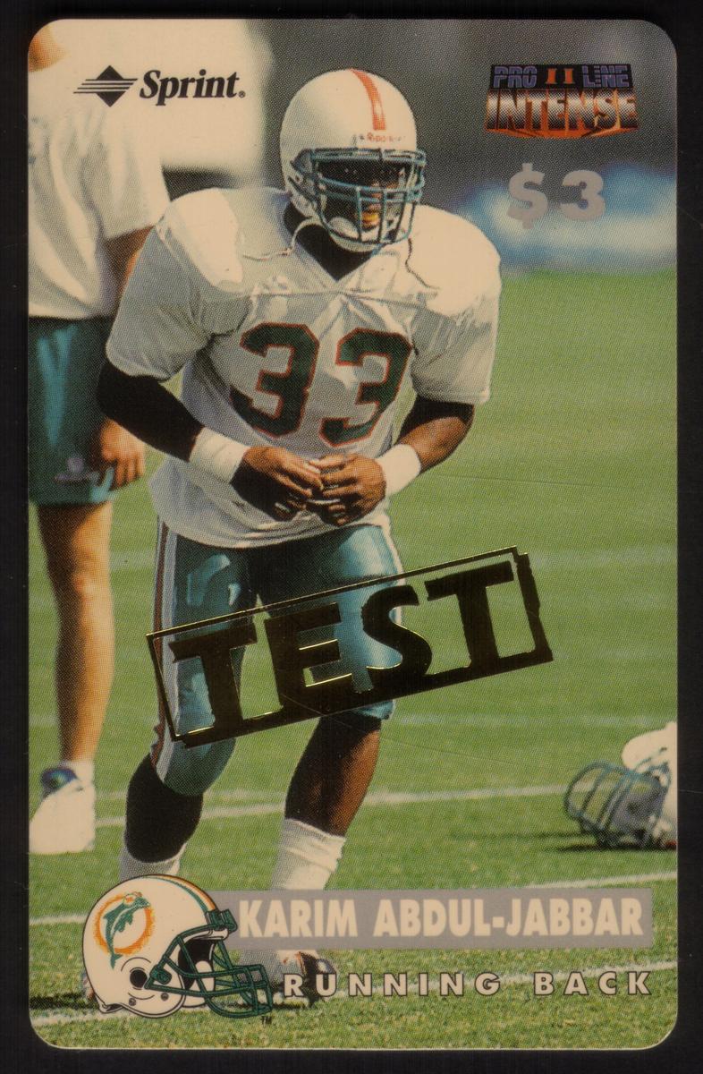 A large, black "TEST" stamp is printed across the center of the card's front. The overall design and details identify this as a 1997 Pro Line Intense football collectible card issued by The Score Board Inc. Karim Abdul-Jabbar is depicted in realistic photographic detail with authentic team colors and gear.