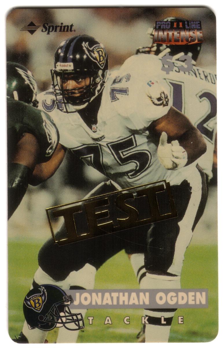 The front of the card includes clear text identifying Jonathan Ogden along with the Proline Intense branding. The Score Board Inc. is noted as the issuing company. The imagery focuses on Ogden’s football pose, highlighting his role as a player in the NFL.