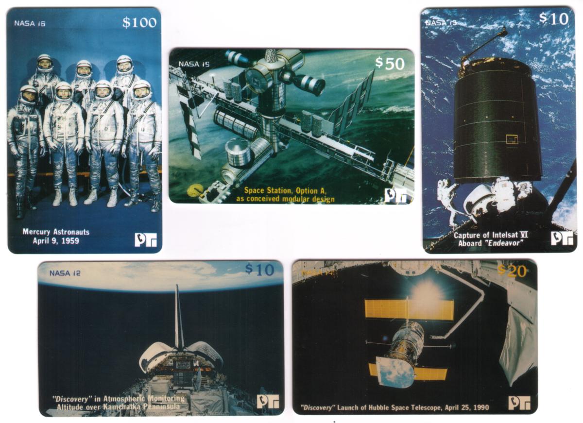 This set of 16 collectible prepaid telecom cards from NASA showcases iconic moments and equipment related to U.S. space exploration history. The images include the Mercury Astronauts group portrait dated April 9, 1959, capturing the pioneering crew in their space suits. Another card highlights the launch of the Hubble Space Telescope aboard Space Shuttle Discovery on April 25, 1990. The lunar module Eagle and astronaut on the moon, commemorating Apollo 11's first moon landing on July 20, 1969, is also featured. Shuttle launches and landings are presented, including Columbia’s first launch on April 12, 1981, Endeavor atop the Mobile Launcher Platform, and Atlantis atop the Boeing 747 Shuttle Carrier Aircraft on December 8, 1991.