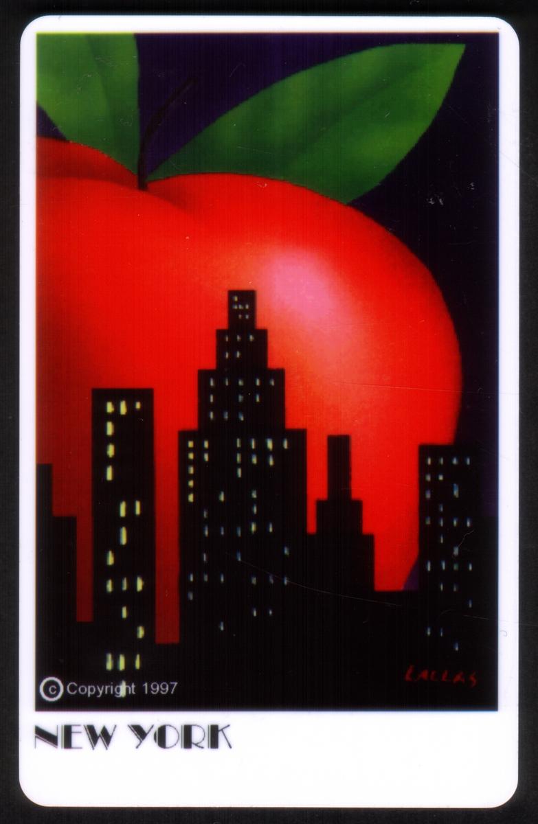 This collectible phone card features an artistic representation of the New York City skyline, prominently showcasing iconic structures under a clear blue sky. The design includes illustrations of several tall buildings situated along the waterfront, with reflections visible on the water’s surface. A large red apple, symbolizing the city's nickname "The Big Apple," is prominently placed on the right side of the image, reinforcing the connection to New York City.
