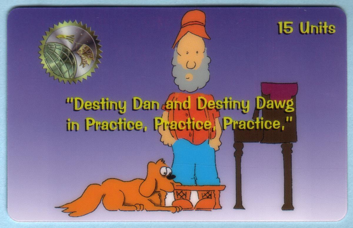 This card is identified as a specimen issued by Destiny Telecomm and is part of the Destiny Dan and Destiny Dawg cartoon art series. It highlights the connection between animals, cartoons, and musical instruments through its engaging artwork. The overall design is lively and colorful, appealing to collectors interested in artistic and musical cartoon themes.