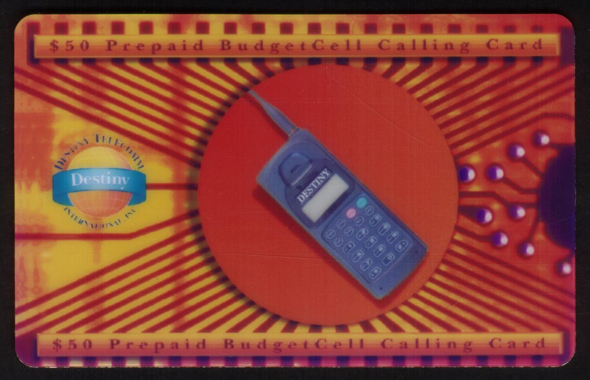 This collectible phone card reflects corporate promotional purposes, specifically tailored for prepaid cellular services offered by Destiny Telecomm. It serves both practical telecommunications functions and collectible value due to its promotional and specimen status.