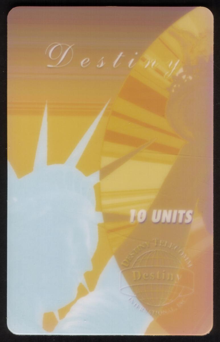The card bears the text "Destiny Telecomm," identifying the issuer as Destiny Telecomm. The denomination reads "10u," indicating the chip value. The card’s overall design centers on honoring American history and historical landmarks, specifically the Statue of Liberty, which is a symbol of freedom and Americana.