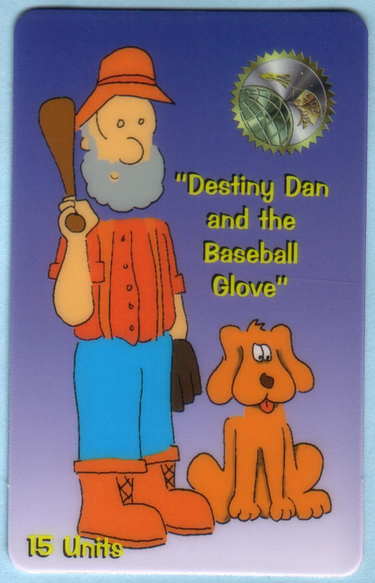 This collectible chip card features cartoon characters named Destiny Dan and a dog, both centered around a baseball theme. Destiny Dan is depicted wearing a blue baseball uniform holding a baseball glove in his left hand. The dog character, standing next to Destiny Dan, wears a baseball cap and holds a similar glove in its right paw. The art style combines elements of cartoons and sports, highlighting baseball gloves prominently in the design. The background is a simple, light-colored backdrop that keeps the focus on the characters.