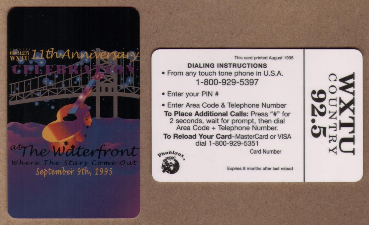 This phone card visually conveys a musical and festive atmosphere linked to the WXTU Country 92.5 radio station’s anniversary event by the waterfront, combining iconic elements of live music and an urban riverside landmark to mark the 1995 celebration.
