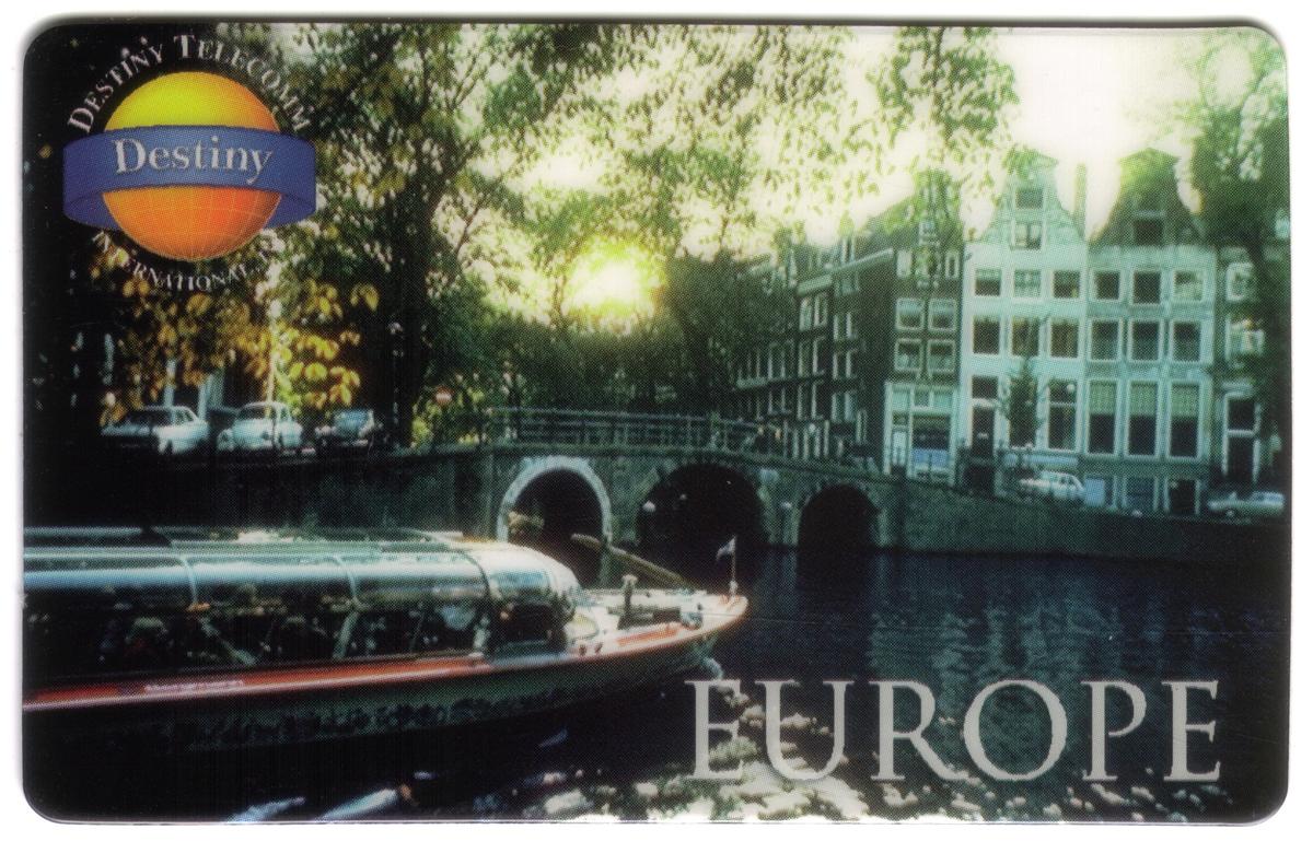 Additional cards in the collection show a lakeside village with medieval architecture and conical rooftops, and a large stone castle surrounded by water, both also labeled "EUROPE" at the top and featuring the Destiny Telecomm logo in the lower left corner. The final card depicts an urban canal scene with a boat docked alongside a canal, arched stone bridges, and European-style houses lining the water, all under the "EUROPE" text and Destiny Telecomm branding.