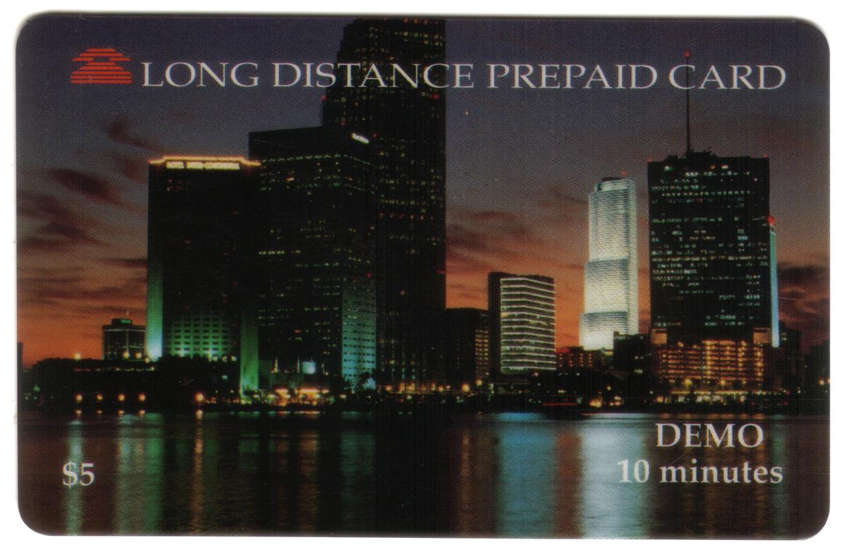 Overall, the card highlights key sightseeing elements of Miami, emphasizing its waterfront and architectural features. The clean, sharp photographic image combines natural and urban elements, presenting a distinctive view of the city at evening light. The card is designed for long-distance prepaid use, as indicated by “long distance prepaid card” text.