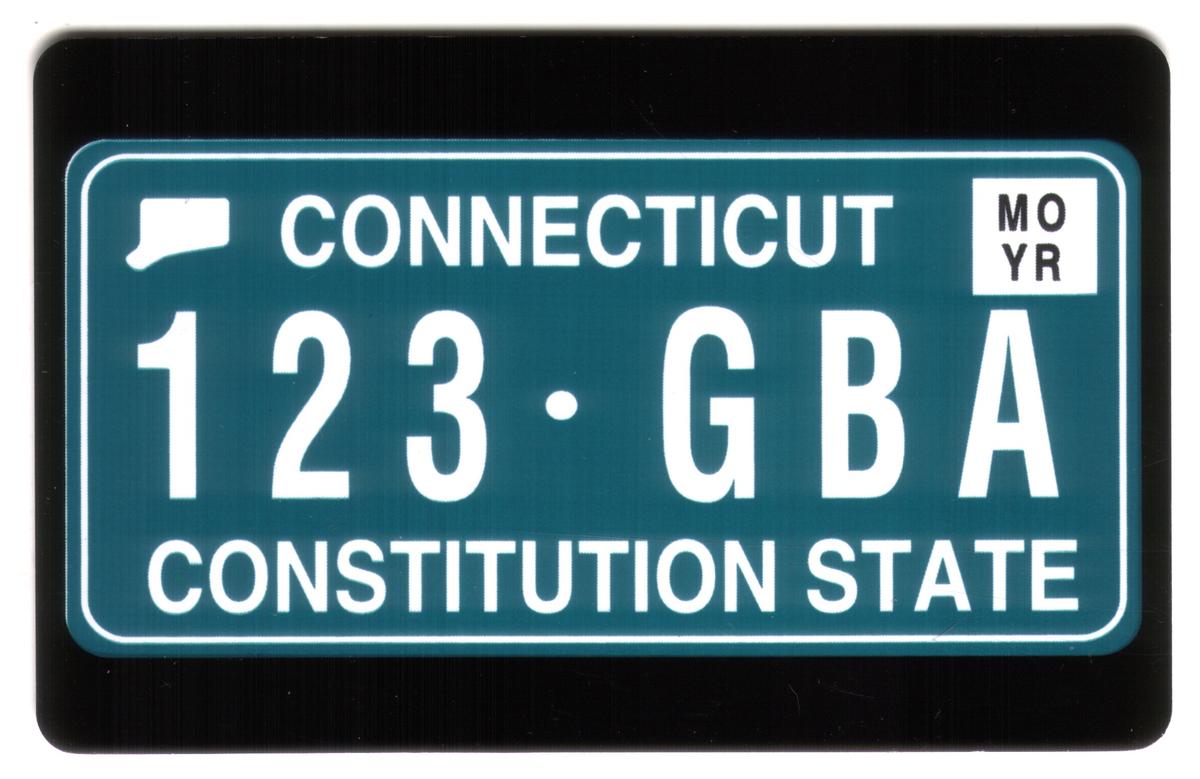 The license plate image is bordered by a white outline, giving it a distinct, framed appearance on the card. In the top left corner, there is a small white silhouette of the state of Connecticut, further emphasizing the card’s connection to this US state. This collectible represents automotive Americana from the Northeastern United States.