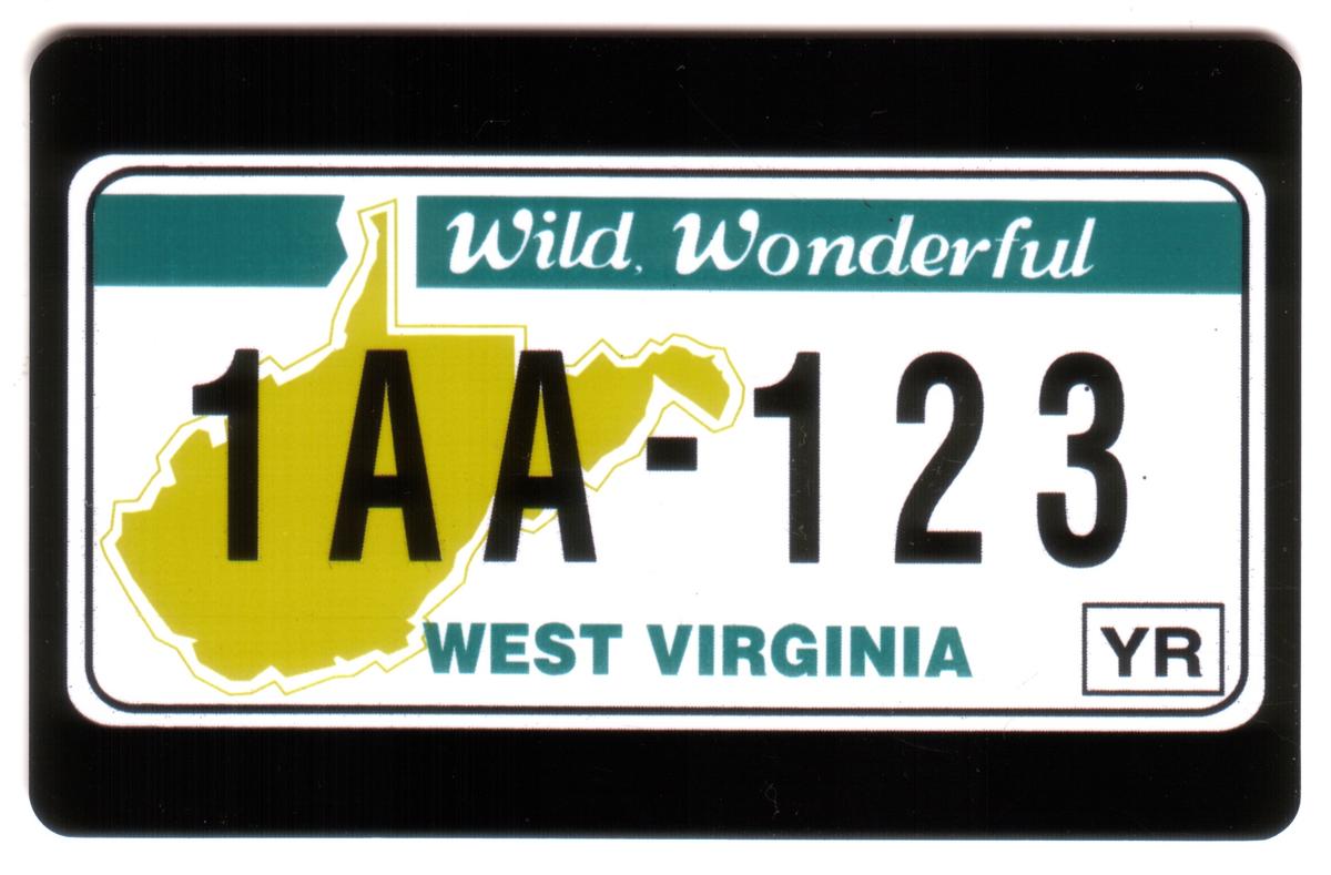 The card also presents a depiction of a classic West Virginia license plate, set against a clean white background. This license plate includes the text "West Virginia" and the slogan "Wild Wonderful," reinforcing the state pride theme. The license plate features a blue border and a simple, straightforward layout. The numeric or alphanumeric identifiers typically found on license plates are not present, keeping the focus on the state’s identity and slogan.