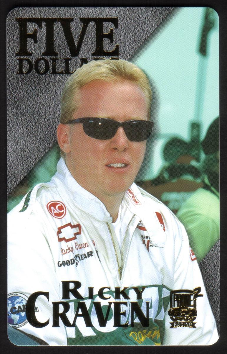 Overall, this collectible car-themed phone card honors Ricky Craven’s participation in NASCAR racing, including recognizable auto racing sponsors and branding from 1997, with clear emphasis on the sport’s corporate imagery and the driver’s name presented boldly on the front.