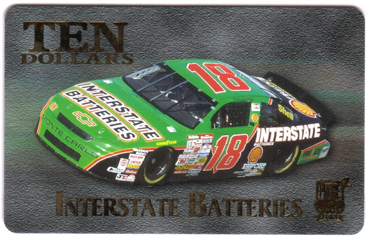 The card has a denomination of ten dollars, with "TEN DOLLARS" printed in large, metallic letters in the upper left corner. The text "INTERSTATE BATTERIES" appears boldly at the bottom, also in a metallic finish that complements the card’s automotive focus. To the right bottom corner, a small emblem that resembles a classic race car is visible, reinforcing the auto racing theme.