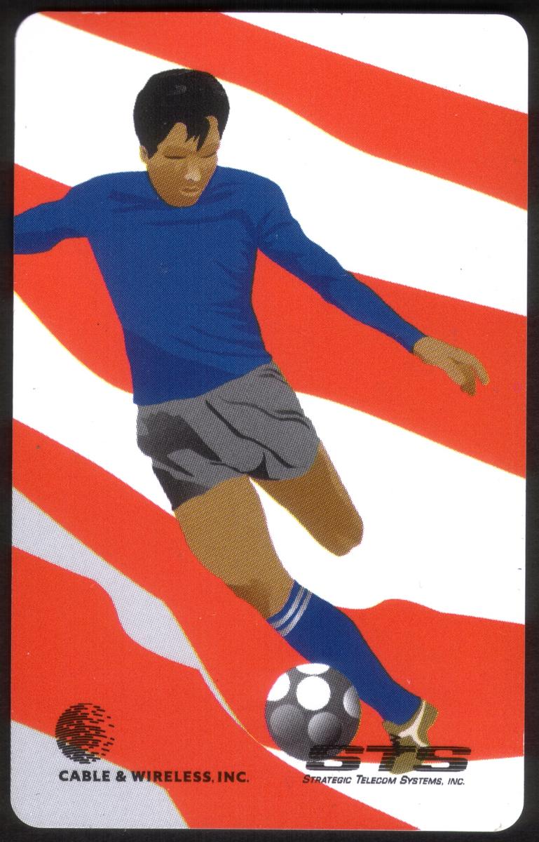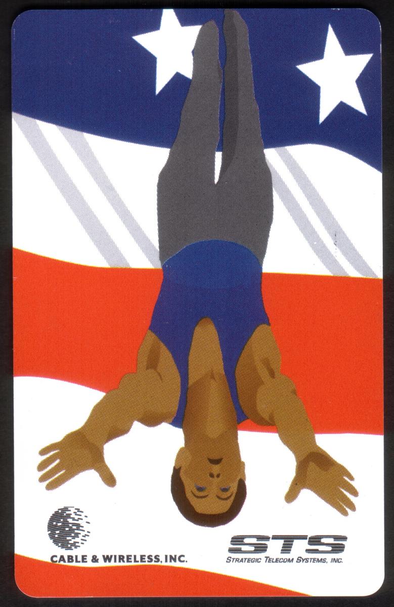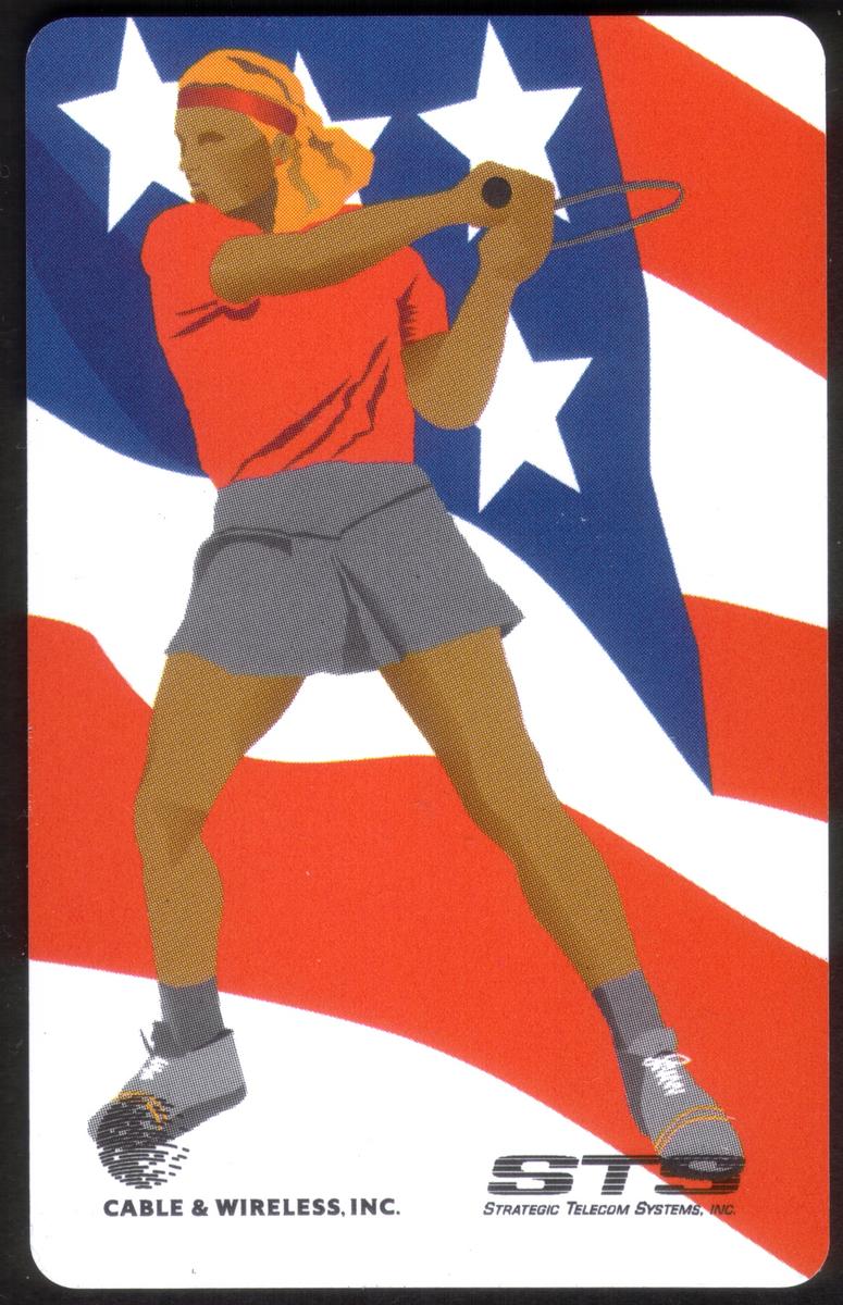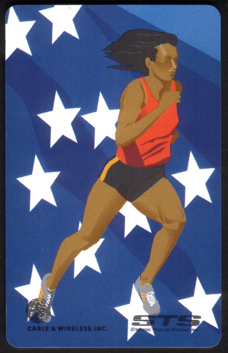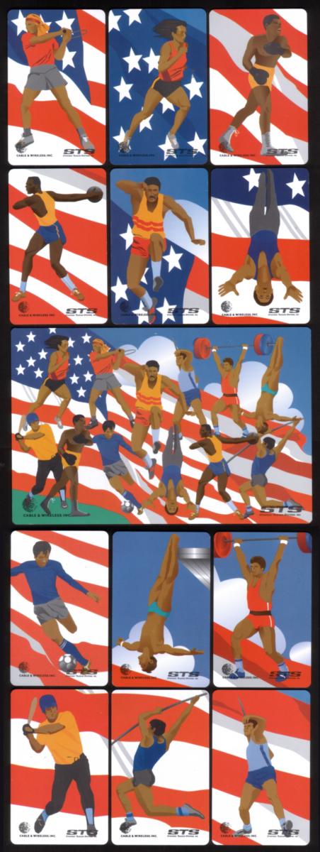 This complete set of 13 collectible phone cards from Cable & Wireless, Inc. and Strategic Telecom Systems, Inc. showcases a vibrant sports collectors series focused on various athletic events. Each card features a stylized illustration of an athlete engaged in a distinct sport, set against a dynamic background inspired by the American flag, with stars and red, white, and blue stripes.