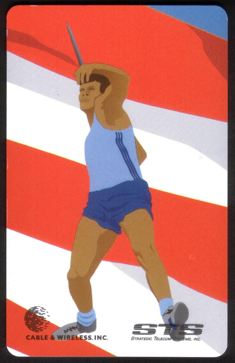 The final card in the set presents a composite collage of all the athletes together, celebrating the diversity and spirit of sports. Each card includes logos of Cable & Wireless, Inc. and Strategic Telecom Systems, Inc., reinforcing the series' official and collectible nature. This set titled C&W 130m Reach For The Emerald Complete Set of 13 Sports, offers a colorful and patriotic tribute to athleticism and competition, making it a valuable collection for sports enthusiasts.