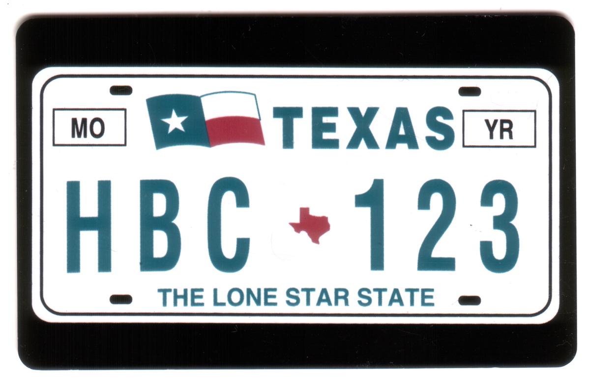 This collectible phone card features a detailed image of a Texas license plate, prominently displaying the Texas state flag and the emblematic Lone Star, representing the state’s nickname, "The Lone Star State." The license plate is designed in classic Texas colors with a white background and red text, along with blue elements that relate to the state flag. The card prominently highlights Americana themes connected to the Southern United States and automotive culture, specifically focusing on Texas.