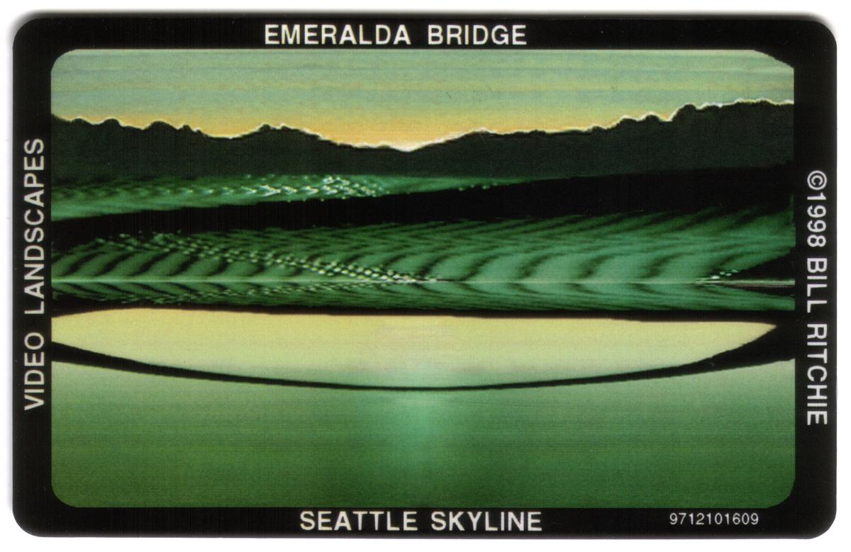 The text on the card includes clear references to the location and artist, ensuring collectors can identify the scene as Emeralda Bridge in Seattle. The overall presentation combines both artistic expression and factual geographic representation, making it a unique collectible for those interested in fantasy art and Washington State landmarks.