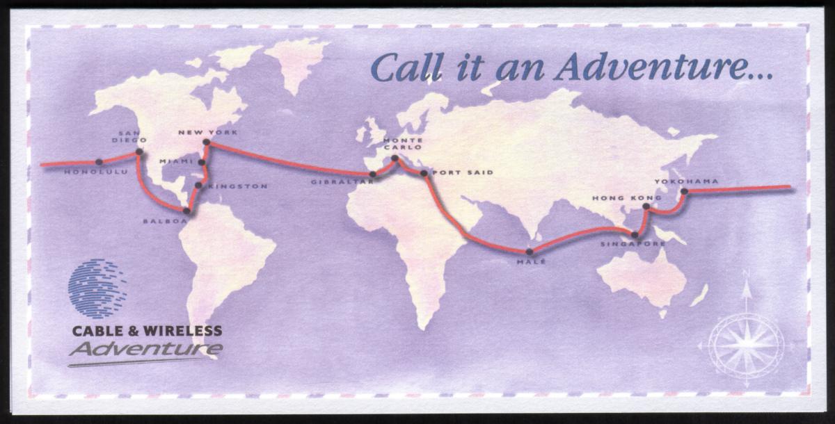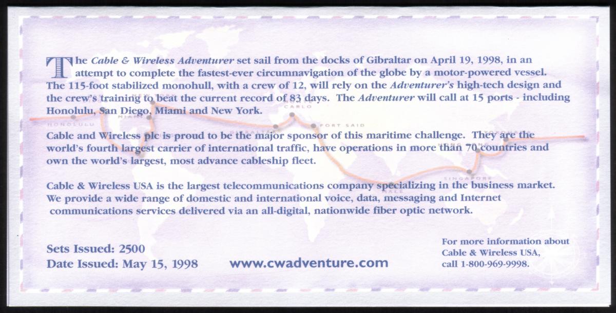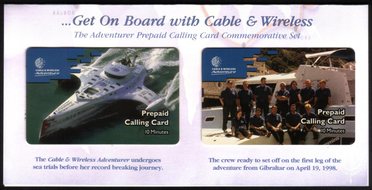 The folder and cards are branded with the Cable & Wireless (CWI) logo, linking the set to the telecommunications company. Text on the cards references "10m Adventurer World Class" and the crew associated with the ship, underlining the significance of the Adventurer and its maritime expedition. The overall presentation captures the essence of a global circumnavigation journey by sailboat, celebrating nautical skill and endurance.