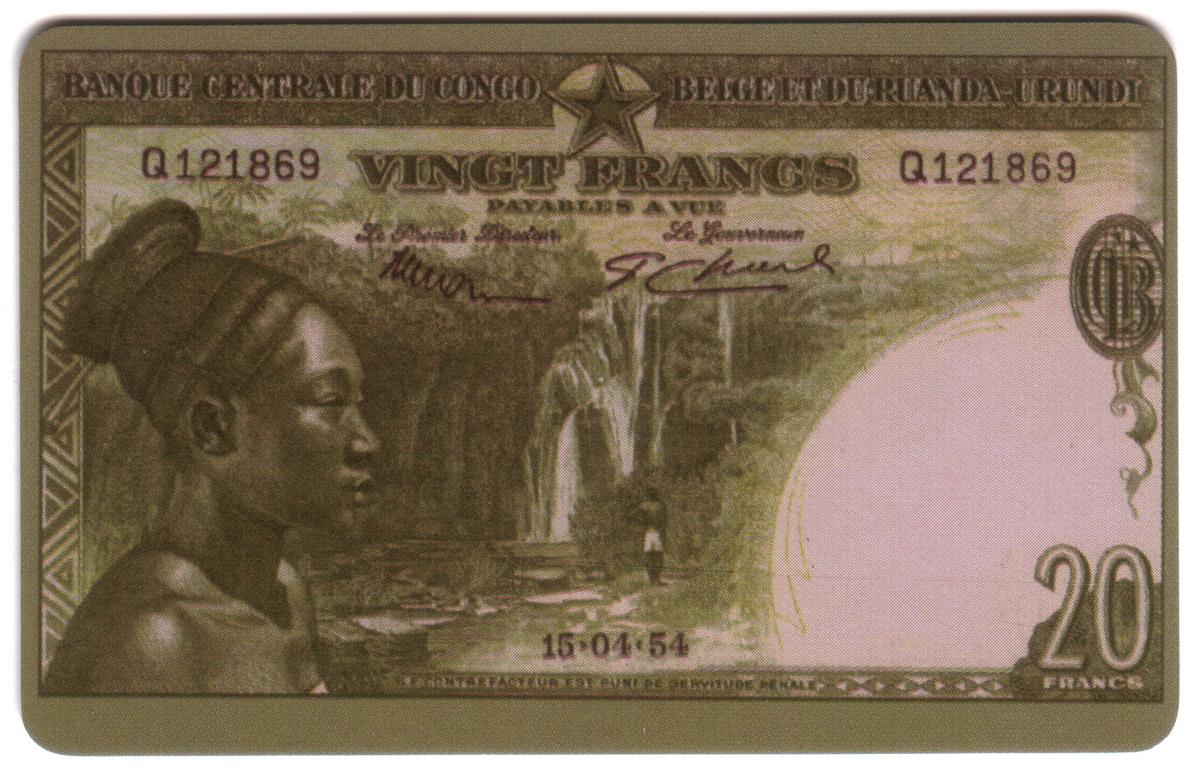 This collectible phone card features the 20 Francs currency design issued by the Banque Centrale du Congo, Belgique et du Ruanda-Urundi. The card vividly displays the profile of an African woman adorned with a traditional hair style, positioned on the left side of the card. Behind her is a detailed depiction of a large waterfall cascading down into a rocky pool, adding a natural and cultural element to the card’s artwork.