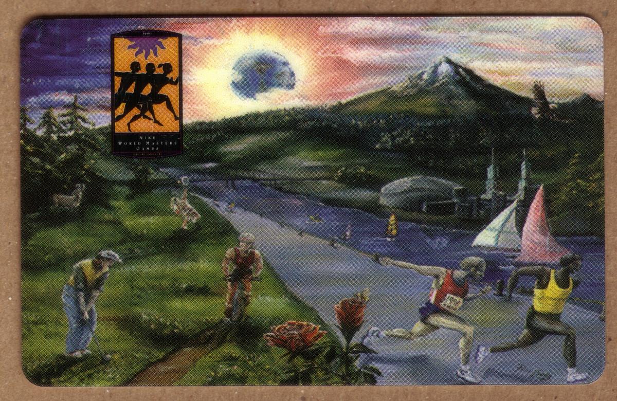 The card is numbered “4 of 4” in a series titled “Game of Life,” which represents a variety of sports under the umbrella of the World Masters Games. The issuer of the card is Z-Tel, Inc., as noted clearly on the front. The composition of the card merges artistic renderings of athletes in action with symbolic elements representing different sports disciplines, emphasizing a celebration of diverse physical activities. The card’s layout includes the “Nike World Masters Games” title, confirming its link to this international multi-sport event.