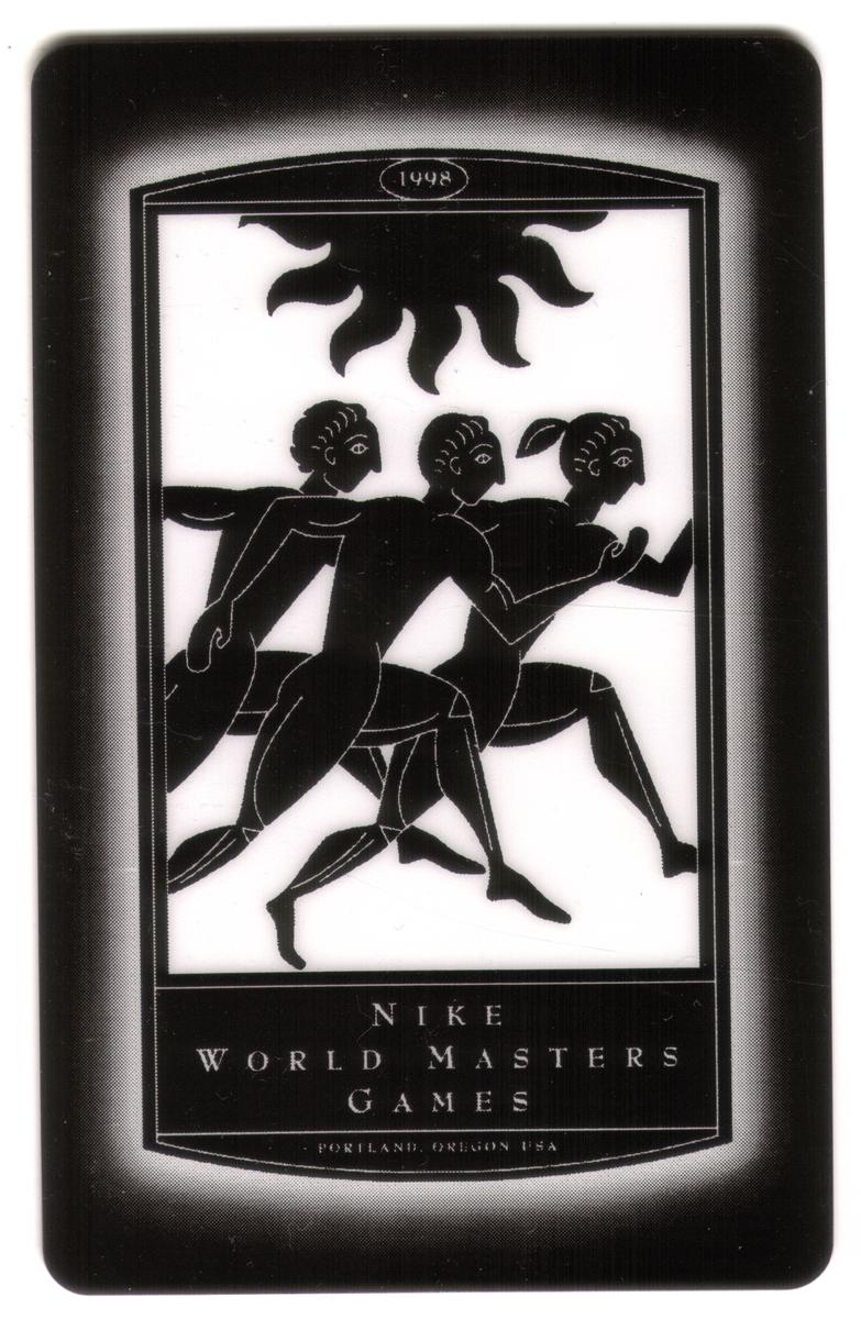 This collectible card features the official logo of the 1998 Nike World Masters Games, presented in black and white. The logo consists of dynamic, intersecting shapes suggesting movement and athleticism, with the text "Nike World Masters Games" prominently displayed. The card also references Portland, Oregon, the host city for the event, aligning the sports theme with this location.