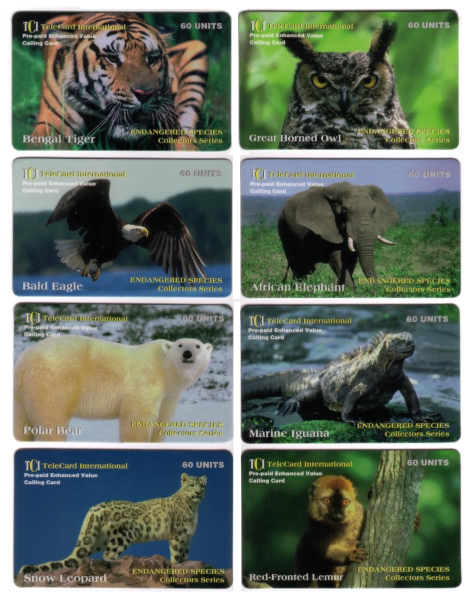 These collectible phone cards are part of the TeleCard International Endangered Species Collectors Series, each valued at 60 units. Each card features a high-quality photographic image of a different endangered animal in its natural habitat or a natural setting, accompanied by the animal’s name prominently displayed in white text on the lower left portion of the card. The phrase "ENDANGERED SPECIES Collectors Series" appears in yellow capital letters on the lower right side of each card, emphasizing the theme of wildlife preservation.