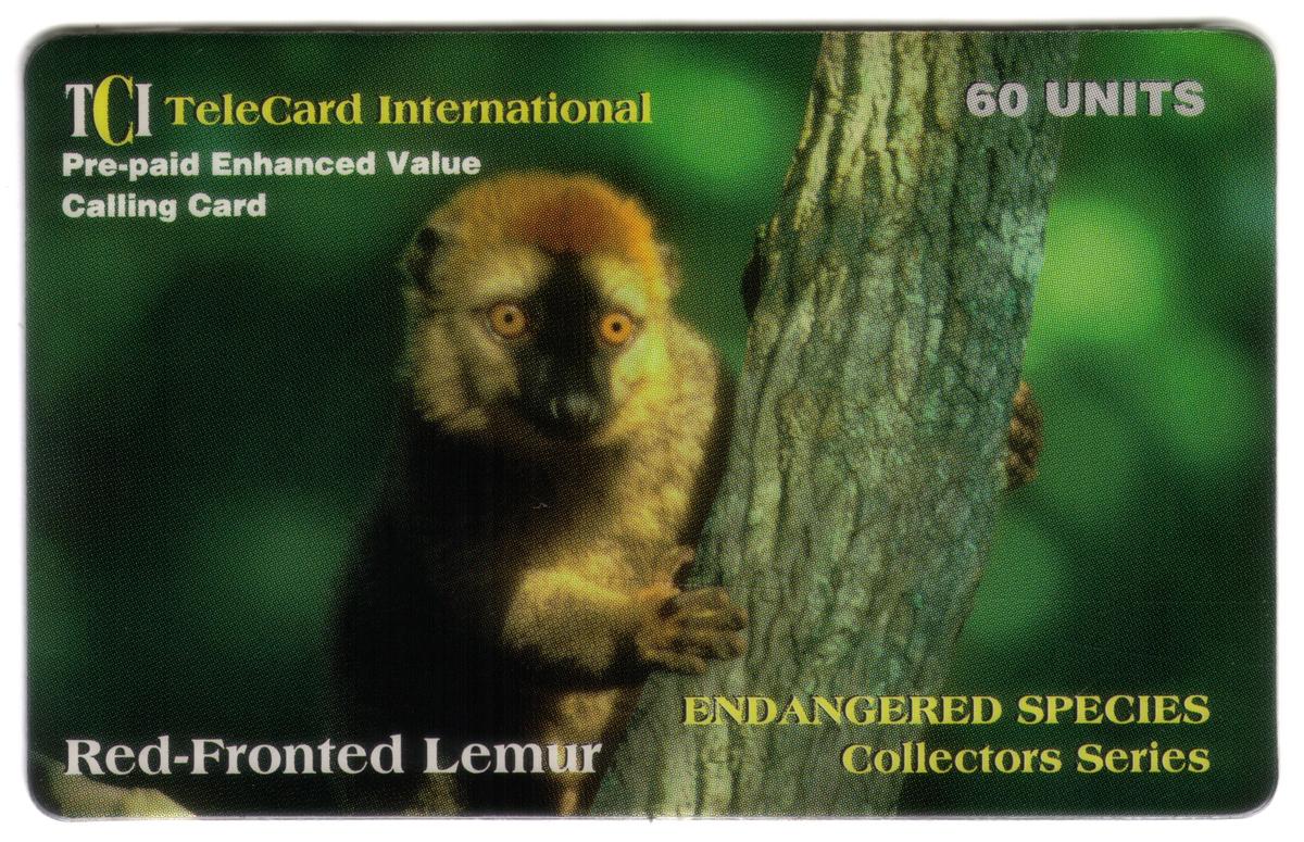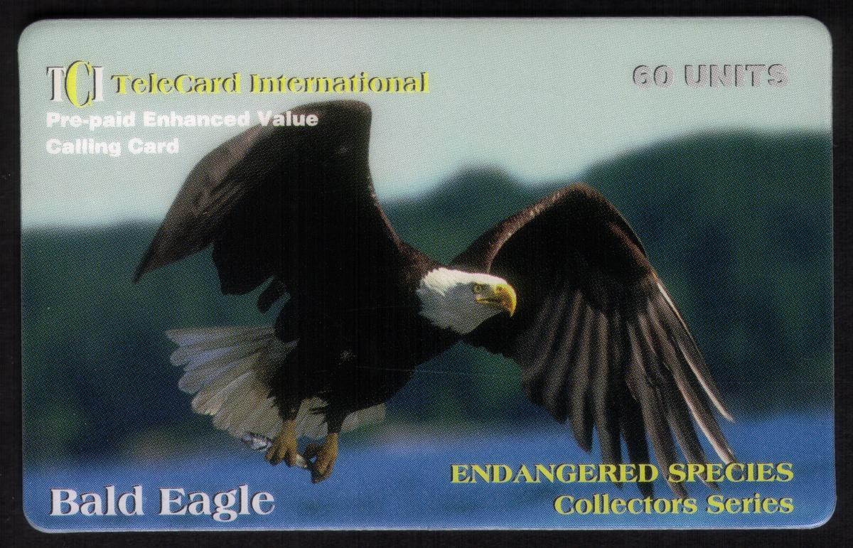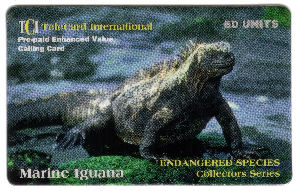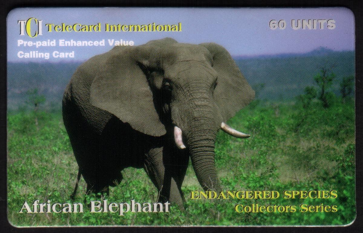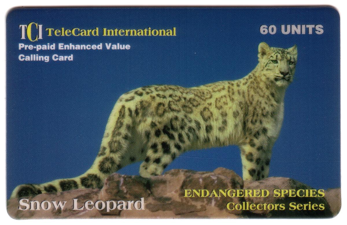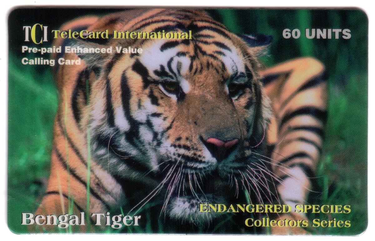 Each card includes TeleCard International’s logo and the text "Pre-paid Enhanced Value Calling Card" in white, placed in the upper left corner. The unit value "60 UNITS" is printed in the upper right corner in gray. The cards combine educational and collectible value by featuring iconic endangered species with visually striking imagery to raise awareness of wildlife conservation through a globally recognized calling card format.