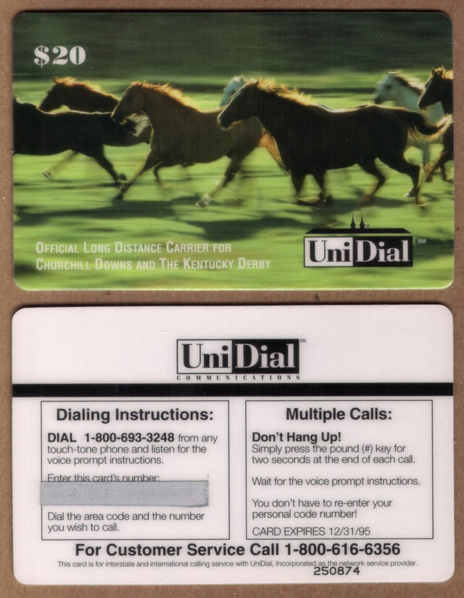 The card includes text identifying the official sponsorship or partnership as the long-distance carrier for Churchill Downs and the Kentucky Derby. The name UniDial Communications is clearly printed on the card, linking it to the telecommunications provider associated with this collectible. The monetary value of the card is $20, prominently displayed to indicate its use and denomination.