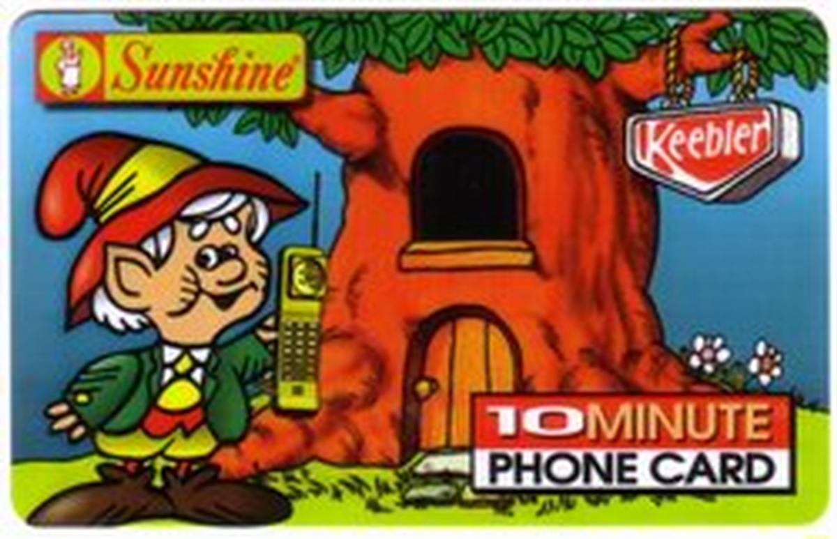 Keywords: Promotional, art - cartoons, artistic, colorful, elves, advertisements, logos, brand names, trademarks, tree houses, flowers, Keebler elf, Sunshine, telephones on phonecards, portable phones on phone cards, MCI Telecommun. Corp.