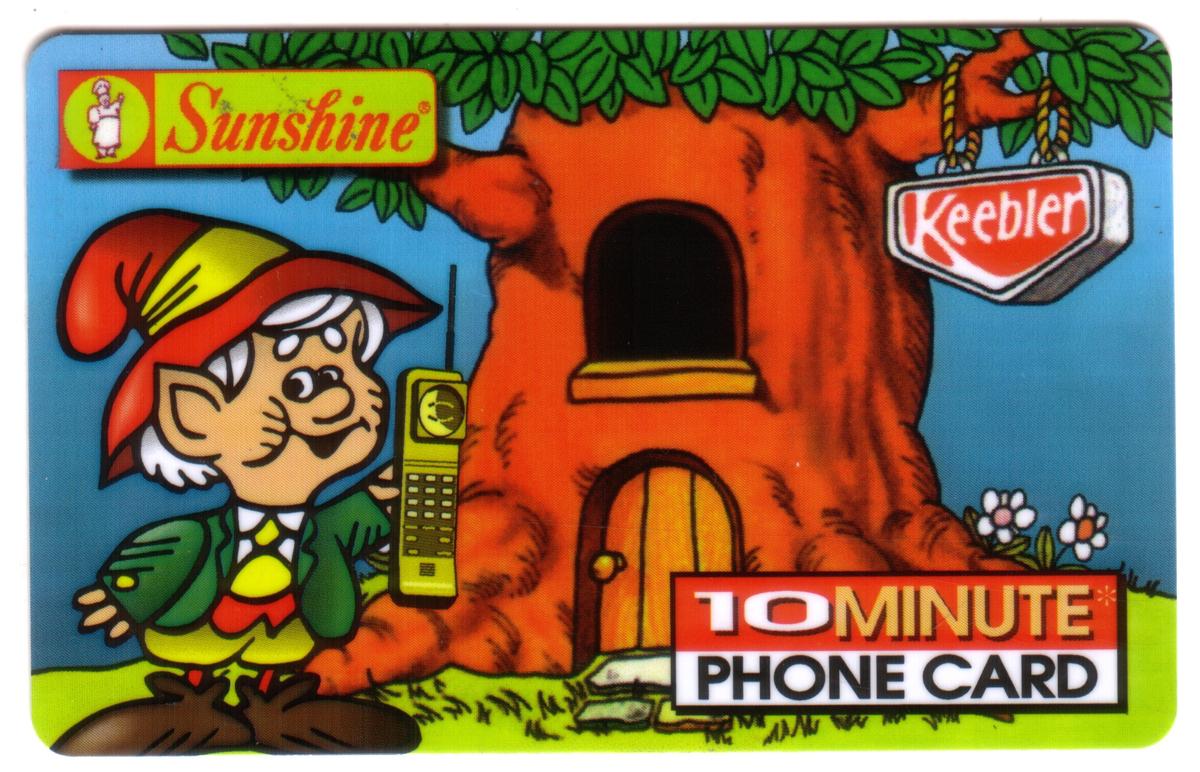 Vibrant Keebler elf and treehouse scene on a 10-minute phone card, featuring colorful cartoon art, brand logos, and nostalgic advertising design. |