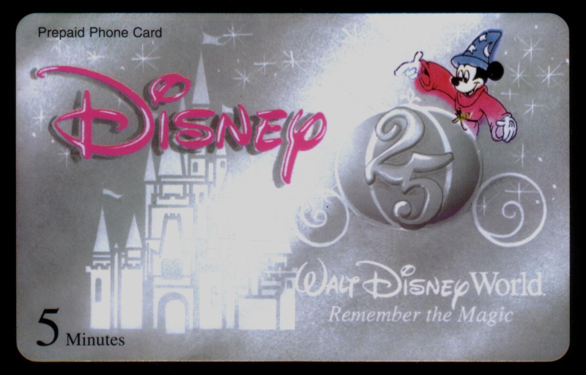 In the lower left corner, the card indicates it provides 5 minutes of prepaid phone use. The overall design incorporates starry, sparkling effects both around Mickey Mouse and the castle silhouette, enhancing the magical theme. This phone card is a tribute to Disney’s animation and amusement parks and celebrates the milestone anniversary with a focus on memorable characters and the iconic castle.