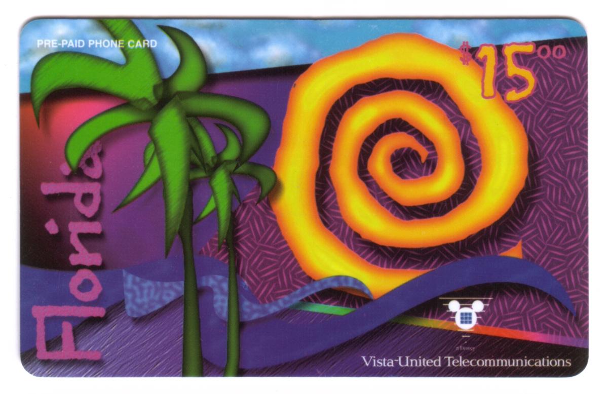 The word "Florida" is written vertically in pink letters along the left side of the card. Near the bottom right corner, the Vista-United Telecommunications logo is visible, accompanied by a small stylized Mickey Mouse head icon, representing Walt Disney, linking the card to Walt Disney World and Disneyland attractions. The overall design evokes a sunny Florida atmosphere with artistic elements tied to theme parks, animation, and amusement.