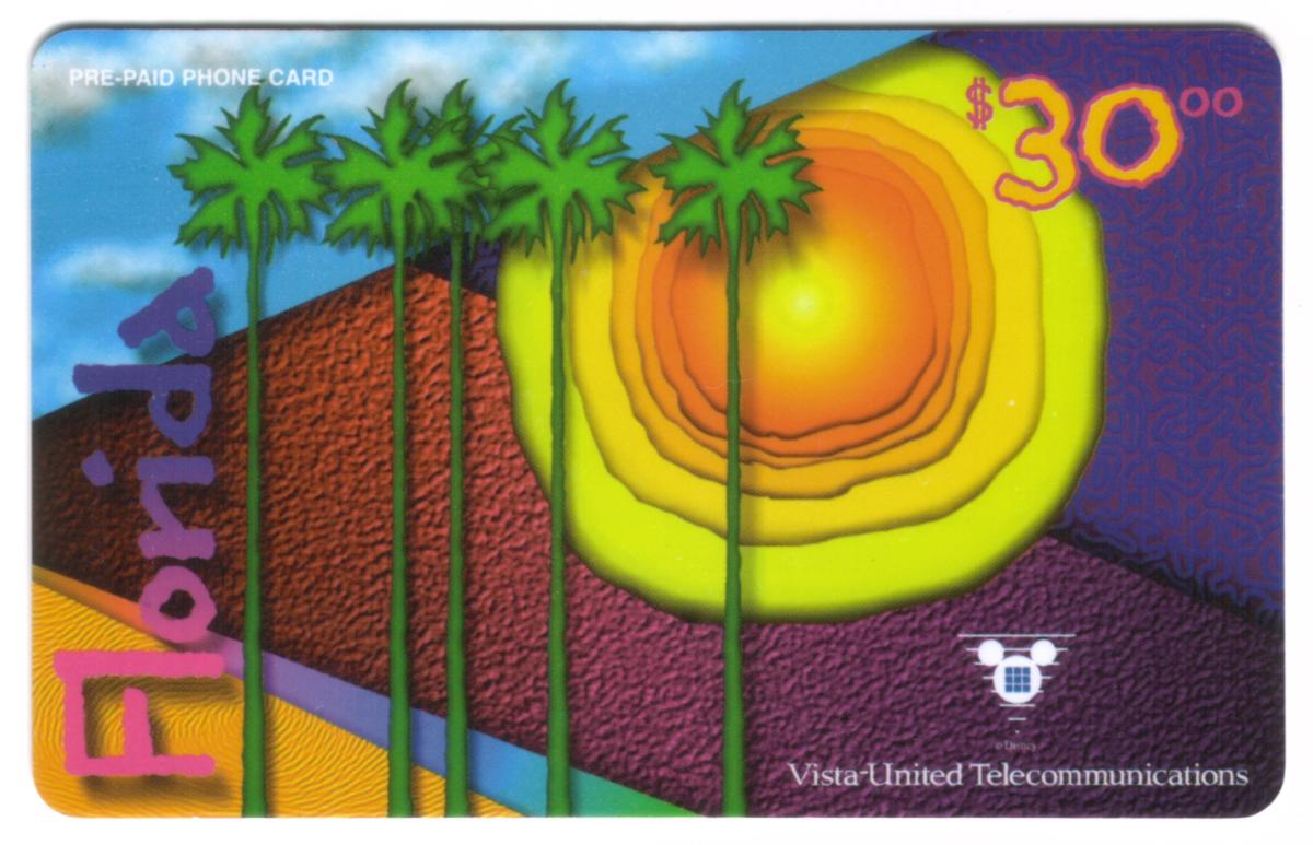 The card has a $30.00 value indicated in the upper right corner in bold orange and purple text. It is issued by Vista-United Telecommunications, whose logo—a small Mickey Mouse head with a grid pattern—is located at the bottom right corner. The overall design reflects a sunny Florida atmosphere, easily associating the card with Florida’s warm climate and iconic palm trees.