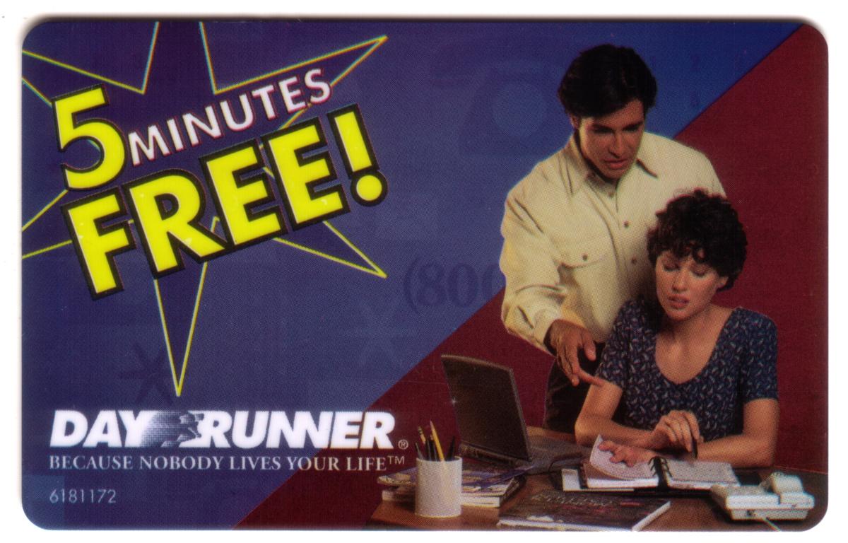 This collectible promotional card features a corporate logo and trademark for "DAY RUNNER" with the tagline "Because Nobody Lives Your Life™" displayed prominently near the bottom left corner. At the top left, the phrase "5 MINUTES FREE!" is presented in bold yellow and white text within a starburst graphic, emphasizing a special offer.