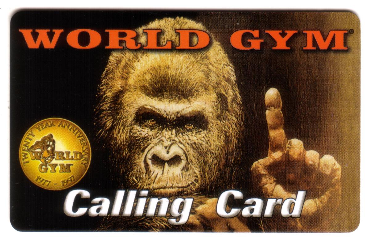 This collectible phone card features a close-up artistic illustration of a gorilla's face and raised hand against a dark brown background. The gorilla is depicted in a serious pose, with its right hand raised and the index finger extended upward. Above the gorilla, the bold orange text reads "WORLD GYM." Below the gorilla, the white text states "Calling Card."