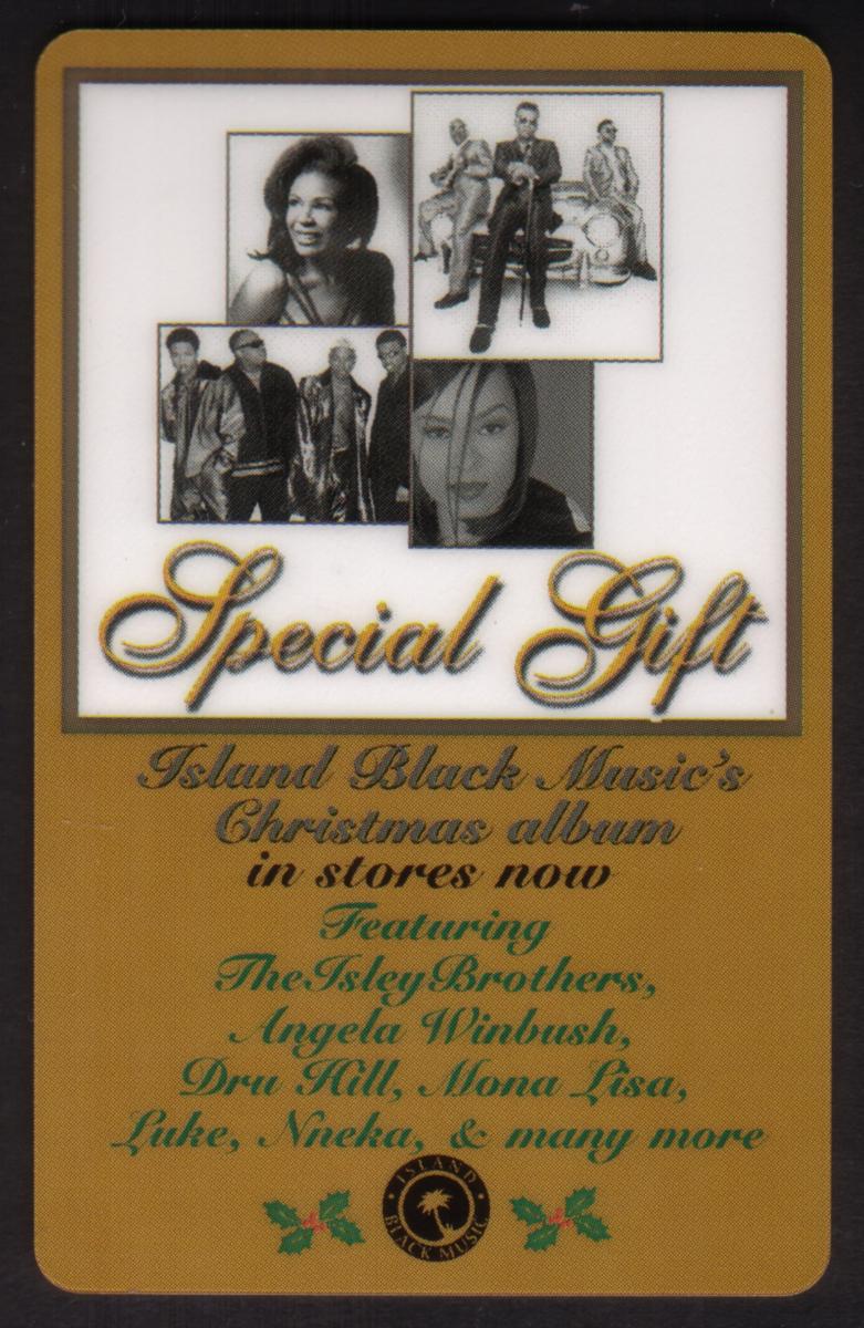 This collectible promotional card highlights "Special Gift," Island Black Music’s Christmas album available in stores. The front of the card features four black-and-white photographic portraits arranged in a collage: a solo female artist in the top left, a group of three musicians standing together on the right, a quartet of male artists in the bottom left, and a close-up of a female artist in the bottom right. These images represent key figures associated with the album.