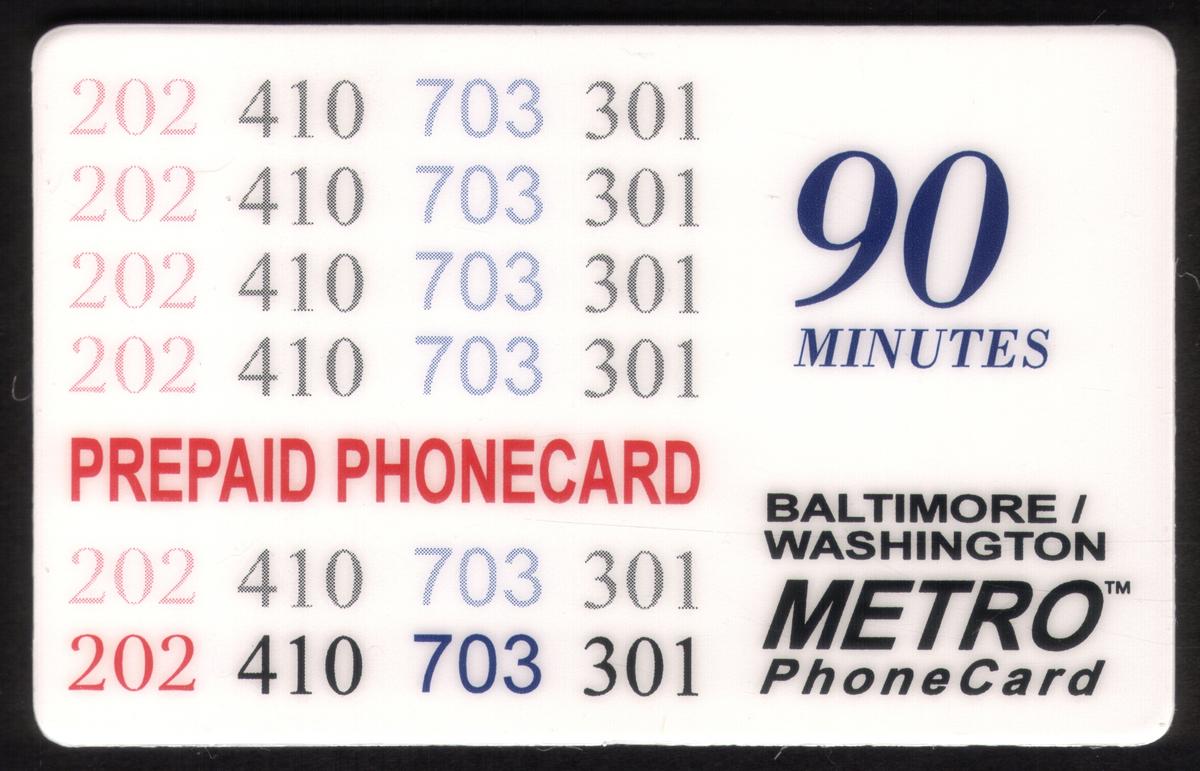 The card’s visual design includes a detailed geographic representation or emblem connected to the Baltimore and Washington area, emphasizing its function as a prepaid calling card for this specific metro region. The inclusion of multiple area codes indicates coverage and usability throughout both Baltimore, Maryland, and Washington D.C., providing convenience for users within this network.