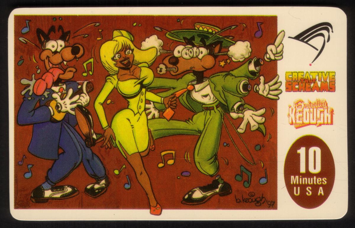 This collectible chip card features colorful artwork from the series "Creative That Screams," created by Bradley Keough. The design prominently displays several cartoon characters styled in a unique and artistic manner, blending elements of animation and comic art. Among the figures are a woman with a blue headband and a friendly expression, alongside various animal characters rendered with expressive faces and dynamic poses, all contributing to an engaging and vibrant composition.