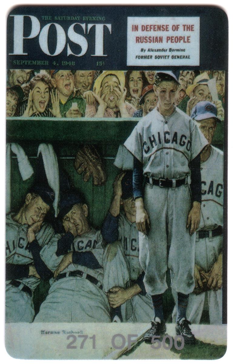 The first card displays the cover from the September 4, 1948 issue of The Saturday Evening Post. It features a young baseball player in a Chicago uniform standing in the dugout, likely the catcher, with an expression of anxiety or nervousness. Behind him, teammates sit or slump on the bench, some with heads in hands, while an animated crowd watches the game. Norman Rockwell’s signature is visible, reinforcing the authenticity and artistic heritage of the piece.