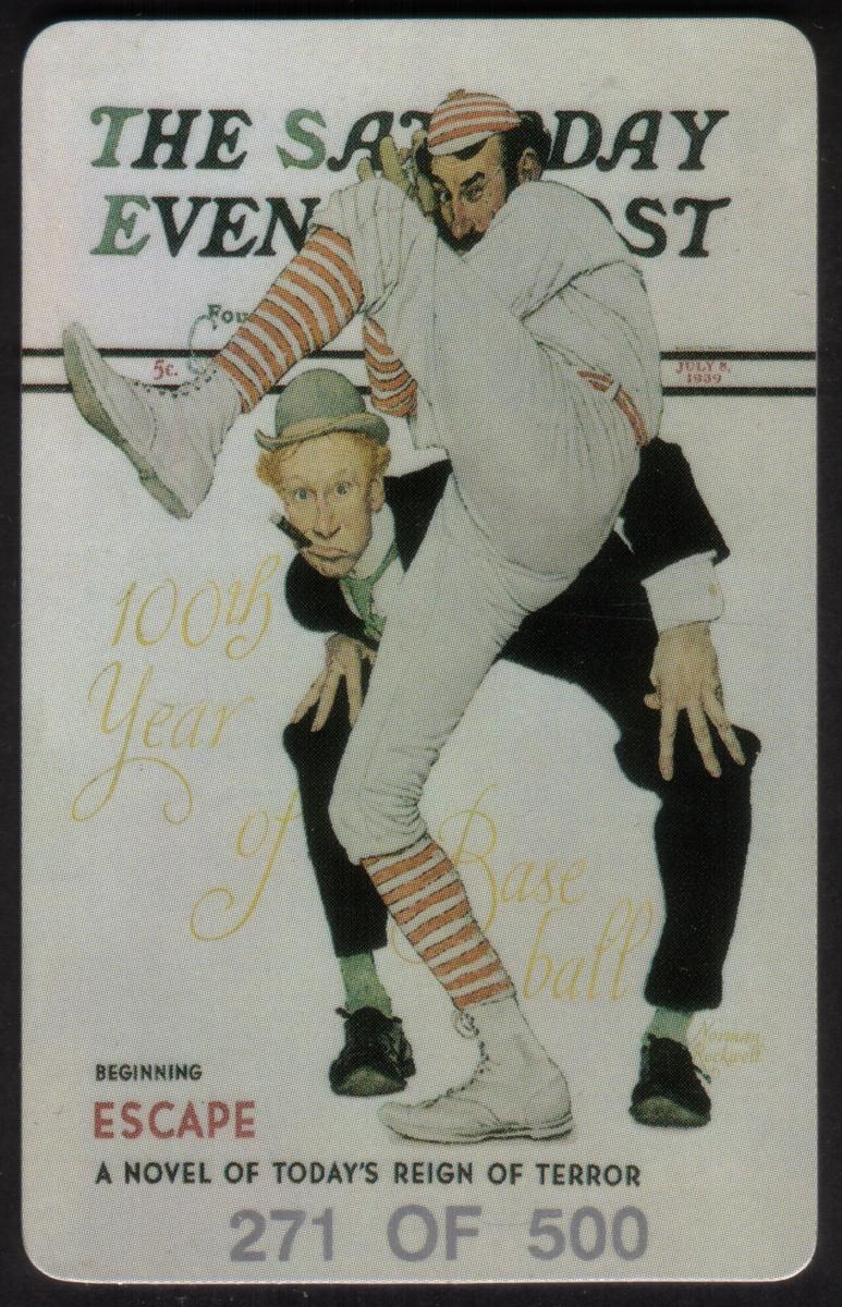 The third card shows a classic baseball scene from another Saturday Evening Post cover dated July 3, 1939. The illustration humorously depicts a playful pose with two men, one carrying the other on his back, both dressed in vintage baseball attire. The text overlay includes "100th Year of Baseball," marking a centennial theme, and mentions the beginning of "Escape," a novel described as "A Novel of Today's Reign of Terror."