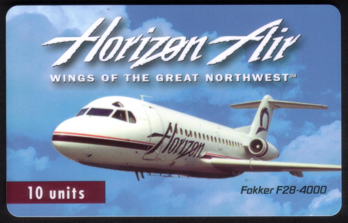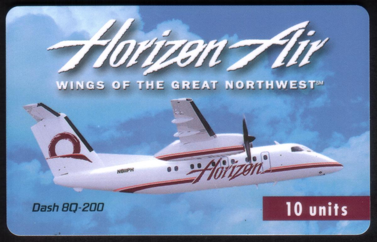 These collectible phone cards feature images of Horizon Air aircraft against a partly cloudy blue sky background. Both cards prominently display the Horizon Air logo at the top in a large white script font, with the slogan "Wings of the Great Northwest" beneath it in smaller capital letters.