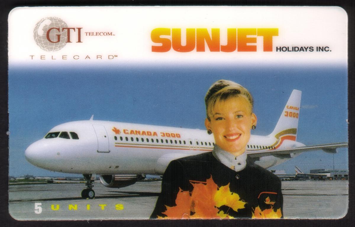 This collectible card features an aircraft and aviation theme prominently related to Canadian airlines and travel. The card displays the logos and trademarks of SunJet Holidays Inc. and Canada 3000, both notable entities in the Canadian aviation and travel industry. A detailed image of a Canada 3000 airplane is visible, accompanied by a stylized illustration of a flight attendant in uniform. The card also includes the GTI Telecom, Inc. corporate logo, indicating its association with telecommunications.