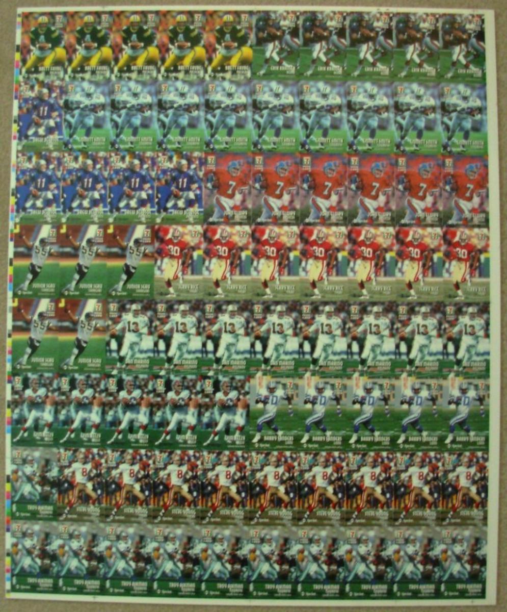 This item is part of a full uncut sheet containing 80 collectible cards, representing the 1996 NFL Series. The sheet serves as a collector’s piece distributed by The Score Board Inc. and 7-Eleven. The use of official NFL branding, player imagery, and the 7-Eleven partnership clearly position this card as part of an authenticated football collectible set centered around professional American football of that era.