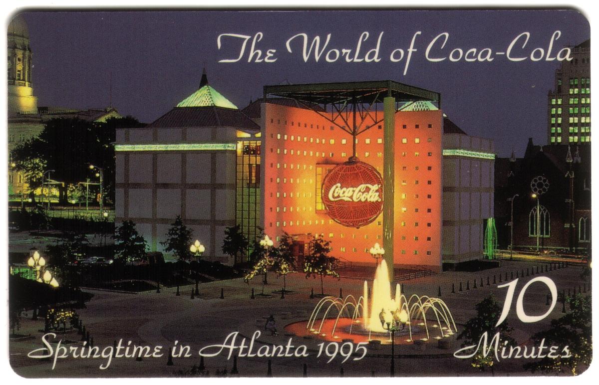 This collectible phone card features a nighttime view of The World of Coca-Cola building in Atlanta, prominently displaying the large, illuminated red Coca-Cola logo in the center. The building is flanked by other structures that have various lighting effects, contributing to the vibrant nighttime scene. A multi-jet fountain with water streams is situated in the foreground, surrounded by lamp posts casting warm glows onto the plaza.