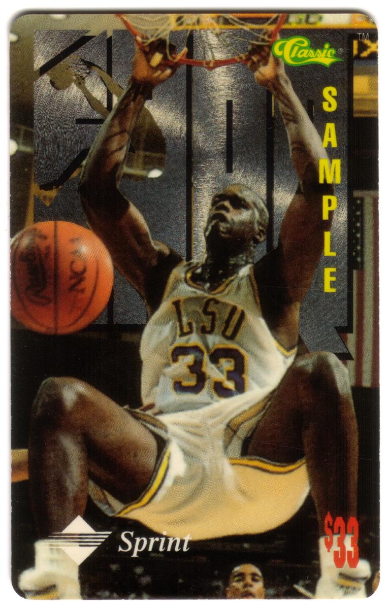 This phone card is associated with basketball, specifically the NBA and National Basketball Association. The card celebrates Shaquille O'Neal's college basketball career at LSU, highlighting his iconic number 33 jersey. The overall design ties together sports imagery with the branding of Sprint and Classic.