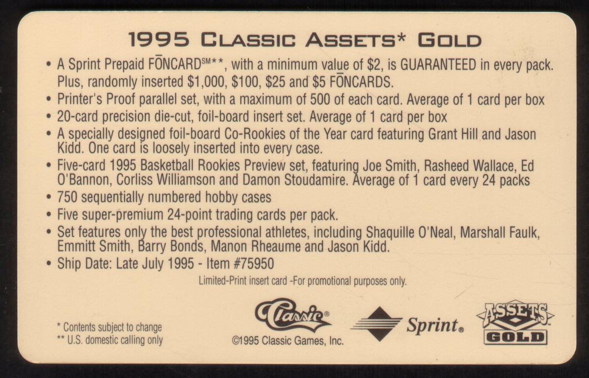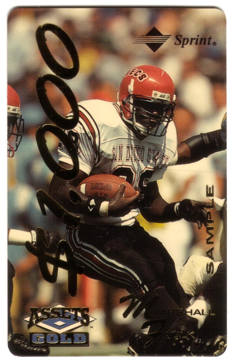 This card relates to the NFL and the National Football League, highlighting football players, specifically Marshall Faulk, a notable figure in the sport. The card originates from The Score Board Inc. and has a collectible value of $1000 as indicated by the "Assets Gold" branding. It serves as a promotional or advertising card connected to these themes.
