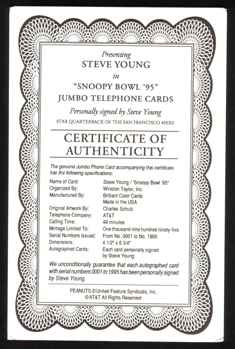 Limited edition Steve Young and Snoopy collectible card featuring authentic autograph, vibrant artwork, and official certificate of authenticity. |