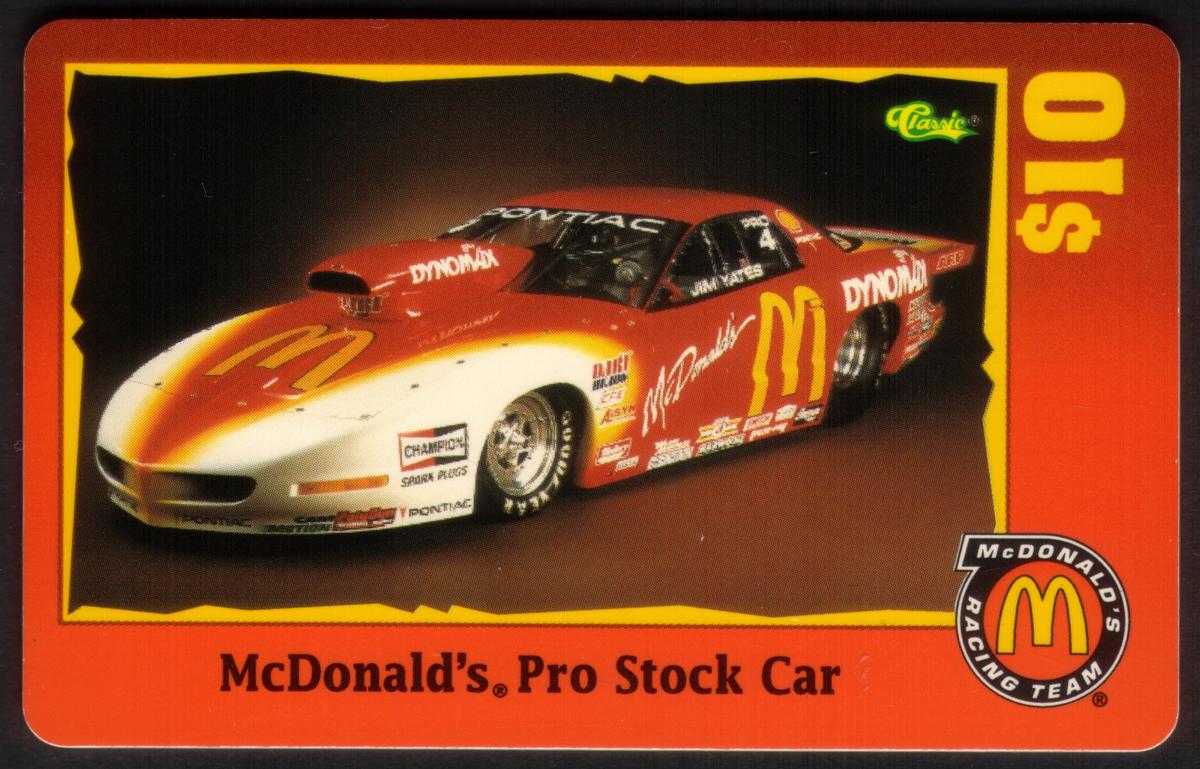 This collectible card features a 1996 McDonald’s Pro Stock Car from an auto racing series. The card highlights a race car prominently numbered #9, representing a racing team competing in the Pro Stock Car category. The design includes logos for McDonald’s and the sport of auto racing, emphasizing its connection to racing events sponsored or associated with McDonald’s in 1996. The card has a $10 denomination clearly marked.
