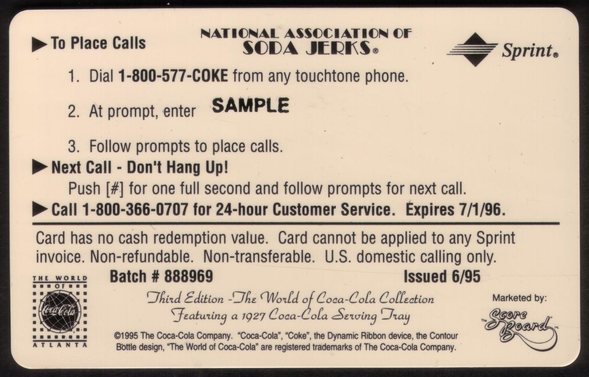 This collectible card was produced by The Score Board Inc. and commemorates the World of Coke Soda Jerk Convention held in 1995. It is a memorabilia item honoring the history and tradition of soda jerks in American culture.